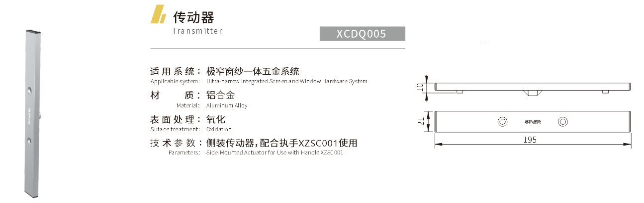 适用系统:极窄窗纱一体五金系统 材质:铝合金 表面处理:氧化 技术参数:侧装传动器,配合执手XZSC001使用