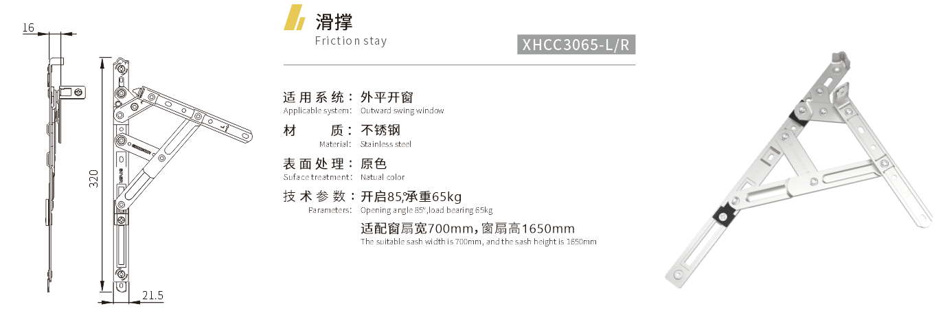 适用系统:外平开窗 材质:不锈钢 表面处理:原色 技术参数:开启85°,承重65kg 适用窗扇宽700mm,窗扇高1650mm