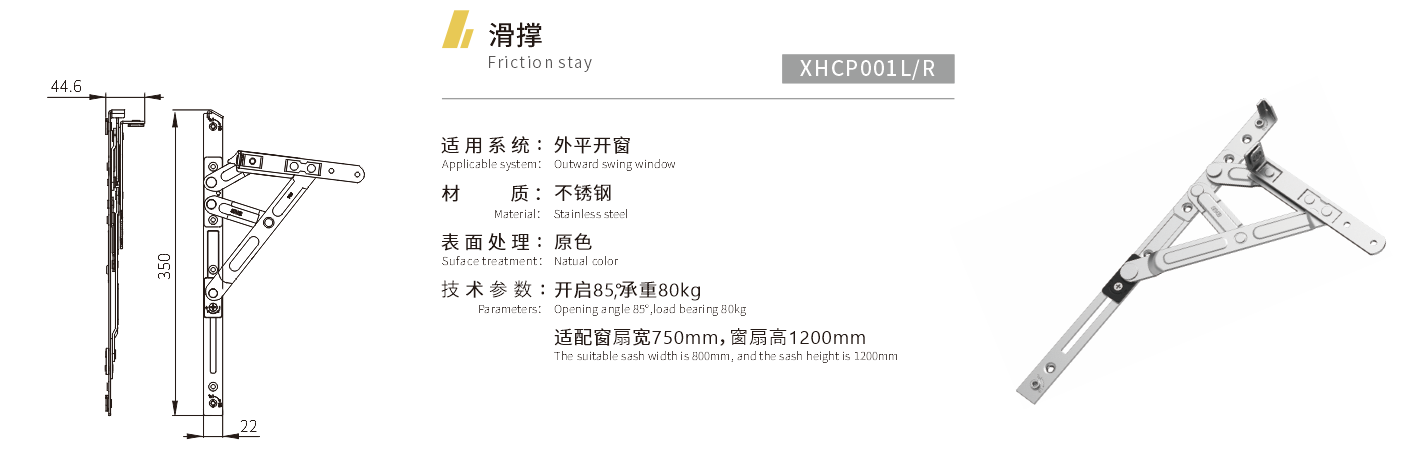 适用系统:外平开窗 材质:不锈钢 表面处理:原色 技术参数:开启85°,承重80kg 适用窗扇宽750mm,窗扇高1200mm