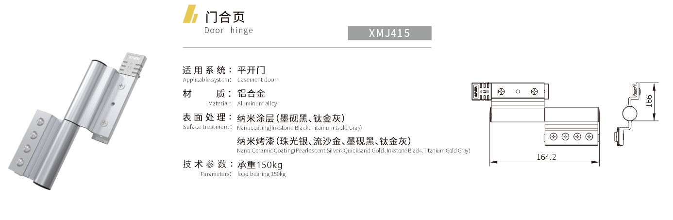 材 质 :铝合金 适用系统:平开门 表面处理:纳米涂层(墨砚黑、钛金灰) 纳米烤漆(珠光银、流沙金、墨砚黑、钛金灰) 技术参数:承重150kg