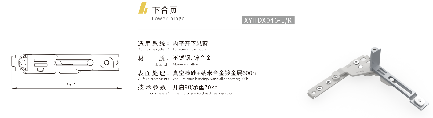 适用系统:内平开下悬窗 材质:不锈钢、锌合金 表面处理:真空喷砂+纳米合金镀金层600h 技术参数:开启90°,承重70kg