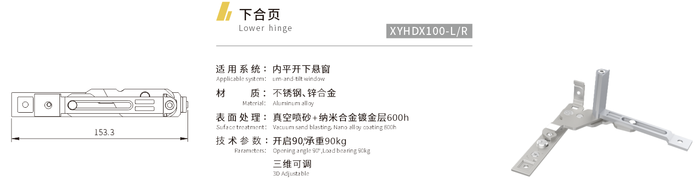 适用系统:内平开下悬窗 材质:不锈钢、锌合金 表面处理:真空喷砂+纳米合金镀金层600h 技术参数:开启90°,承重90kg,三维可调