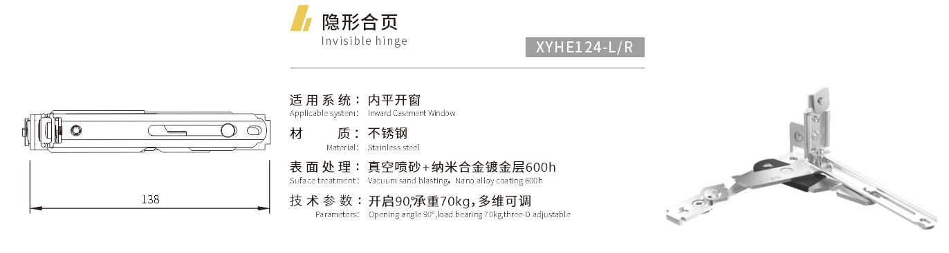 适用系统:内平开窗 材质:不锈钢 表面处理:真空喷砂+纳米合金镀金层600h 技术参数:开启90°,承重70kg,多维可调
