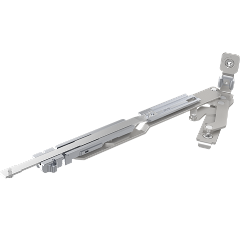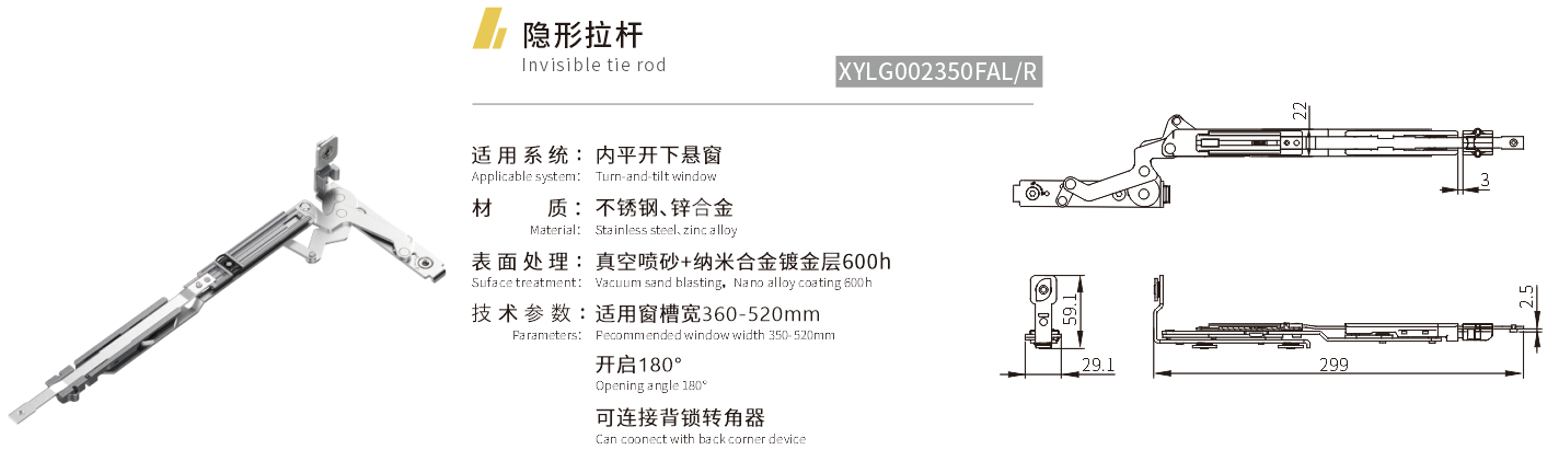 适用系统:内平开下悬窗 材质:不锈钢、锌合金 表面处理:真空喷砂+纳米合金镀金层600h 技术参数:开启180° 适用窗槽宽360-520mm 可连接背锁转角器