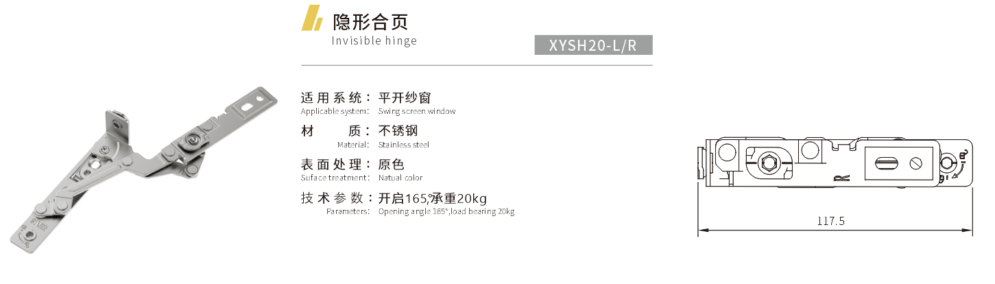 适用系统:平开纱窗 材质:不锈钢 表面处理:原色 技术参数:开启165°,承重20kg