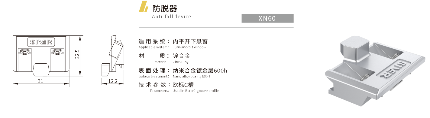 适用系统:内平开下悬窗 材质:锌合金 表面处理:纳米合金镀金层600h 技术参数:欧标C槽