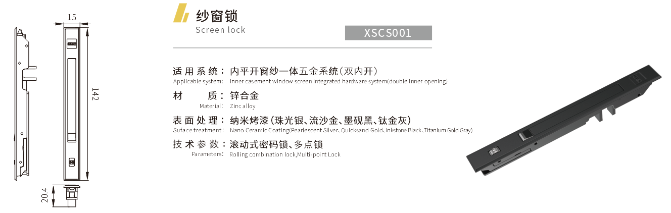 适用系统:内平开窗纱一体五金系统(双内开) 材质:锌合金 表面处理:纳米烤漆(珠光银、流沙金、墨砚黑、钛金灰) 技术参数:滚动式密码锁、多点锁