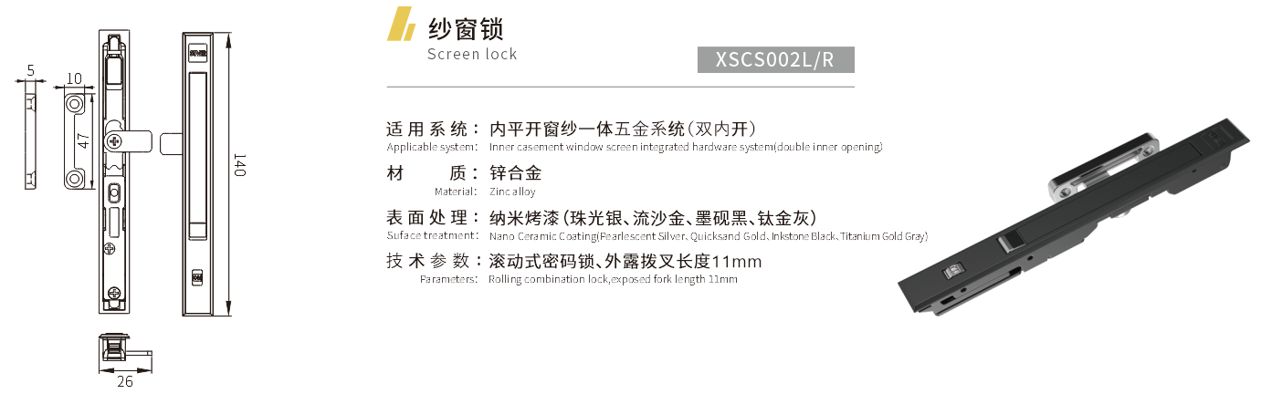 适用系统:内平开窗纱一体五金系统(双内开) 材质:锌合金 表面处理:纳米烤漆(珠光银、流沙金、墨砚黑、钛金灰) 技术参数:滚动式密码锁、外露拨叉长度11mm