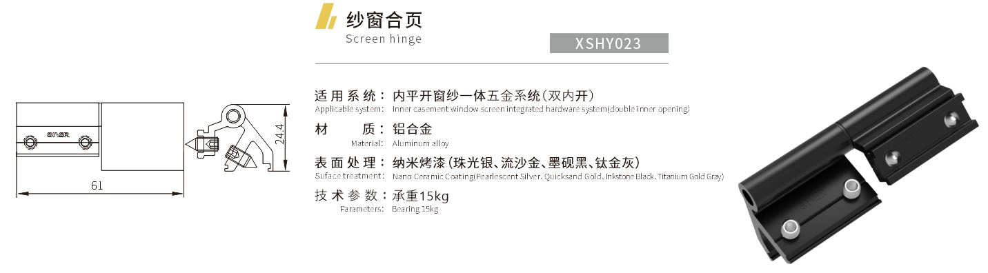 适用系统:内平开窗纱一体五金系统(双内开) 材质:铝合金 表面处理:纳米烤漆(珠光银、流沙金、墨砚黑、钛金灰) 技术参数:承重15kg