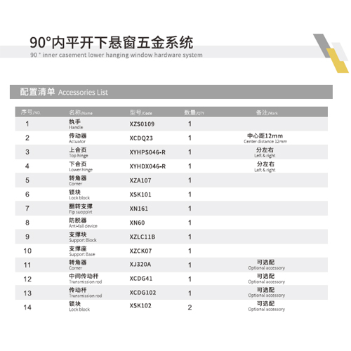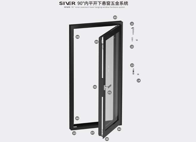 配置说明: 1、合页承载力:≤70Kg,为保持最佳使用状态,建议窗户的宽、高比保持1:1.5左右; 2、可满足窗扇宽460-600mm,窗扇高615-1500mm范围以内的窗型;大小规格窗型可以通过更换③号配件满足; 3、此配置可增加11-14号配件实现增加背部锁点的方案; 4、扇自重(玻璃、扇型材等辅件总重量)Х1.4(安全系数)≤ 合页最大承重; 5、五金件的使用参考目录前页西菲尔维护保养声明。