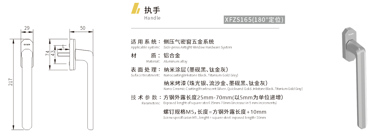 适用系统:侧压气密窗五金系统 材质:铝合金 表面处理:纳米涂层(墨砚黑、钛金灰) 纳米烤漆(珠光银、流沙金、墨砚黑、钛金灰) 技术参数:方钢外露长度25mm-70mm(以5mm为单位递增) 螺钉规格M5,长度=方钢外露长度+10mm