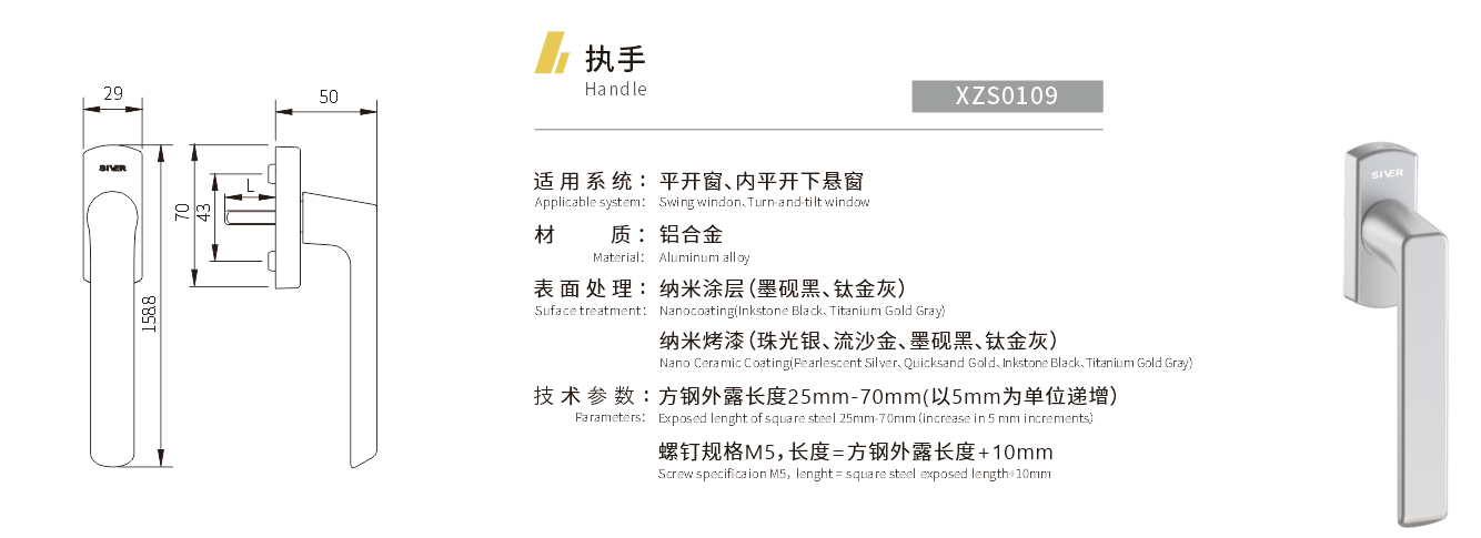 适用系统:平开窗、内平开下悬窗 材质:铝合金 表面处理:纳米涂层(墨砚黑、钛金灰) 纳米烤漆(珠光银、流沙金、墨砚黑、钛金灰) 技术参数:方钢外露长度25mm-70mm(以5mm为单位递增) 螺钉规格M5,长度=方钢外露长度+10mm