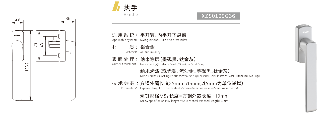 适用系统:平开窗、内平开下悬窗 材质:铝合金 表面处理:纳米涂层(墨砚黑、钛金灰) 纳米烤漆(珠光银、流沙金、墨砚黑、钛金灰) 技术参数:方钢外露长度25mm-70mm(以5mm为单位递增) 螺钉规格M5,长度=方钢外露长度+10mm