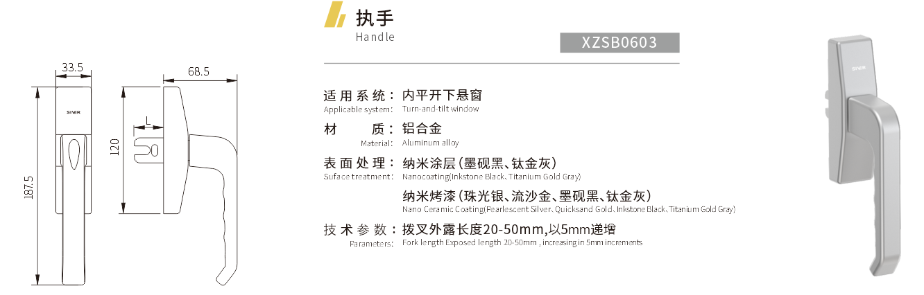 适用系统:内平开下悬窗 材质:铝合金 表面处理:纳米涂层(墨砚黑、钛金灰) 纳米烤漆(珠光银、流沙金、墨砚黑、钛金灰) 技术参数:拨叉外露长度20mm-50mm,以5mm递增