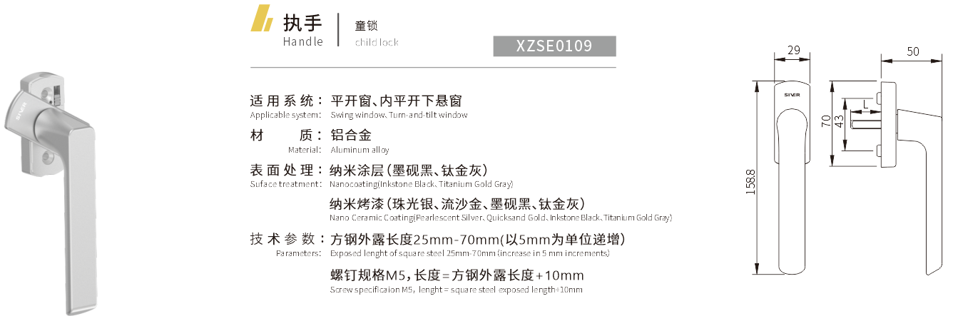 适用系统:平开窗、内平开下悬窗 材质:铝合金 表面处理:纳米涂层(墨砚黑、钛金灰) 纳米烤漆(珠光银、流沙金、墨砚黑、钛金灰) 技术参数:方钢外露长度25mm-70mm(以5mm为单位递增) 螺钉规格M5,长度=方钢外露长度+10mm