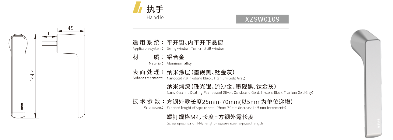 适用系统:平开窗、内平开下悬窗 材质:铝合金 表面处理:纳米涂层(墨砚黑、钛金灰) 纳米烤漆(珠光银、流沙金、墨砚黑、钛金灰) 技术参数:方钢外露长度25mm-70mm(以5mm为单位递增) 螺钉规格M5,长度=方钢外露长度+10mm