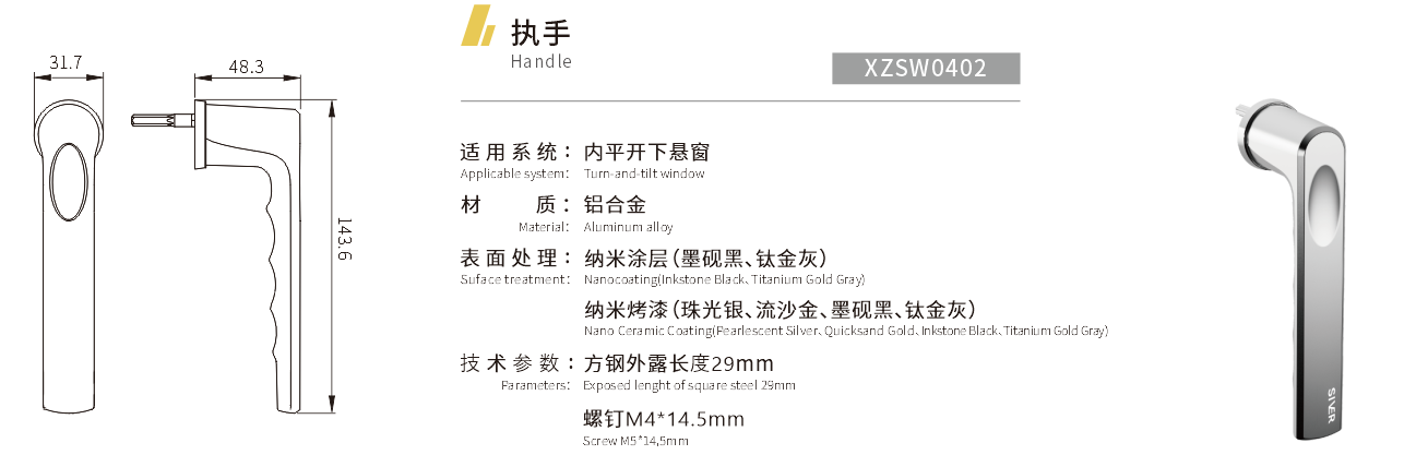 适用系统:内平开下悬窗 材质:铝合金 表面处理:纳米涂层(墨砚黑、钛金灰) 纳米烤漆(珠光银、流沙金、墨砚黑、钛金灰) 技术参数:方钢外露长度29mm 螺钉规格M4*14.5mm